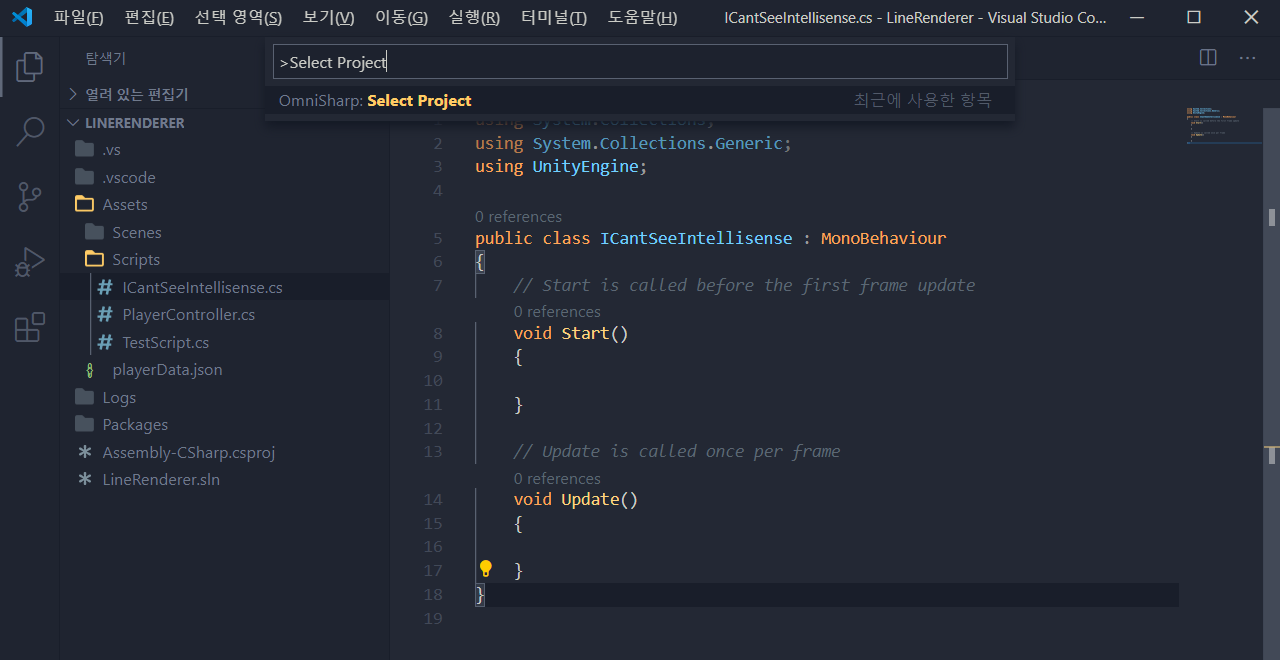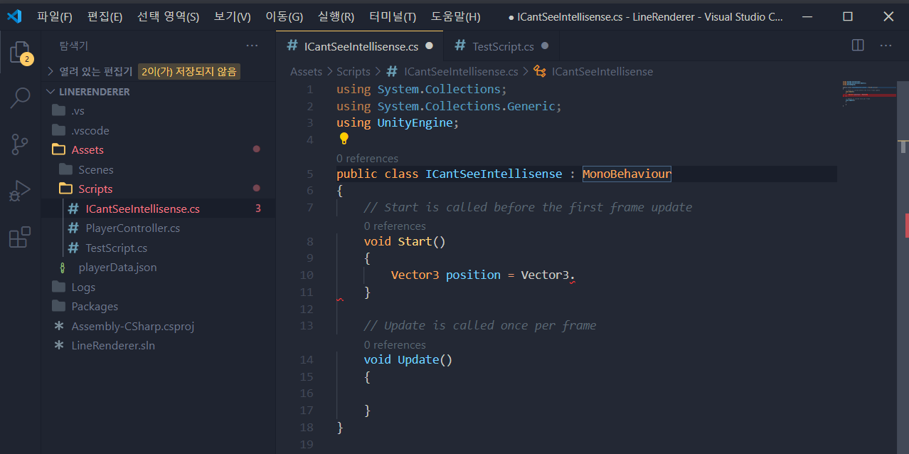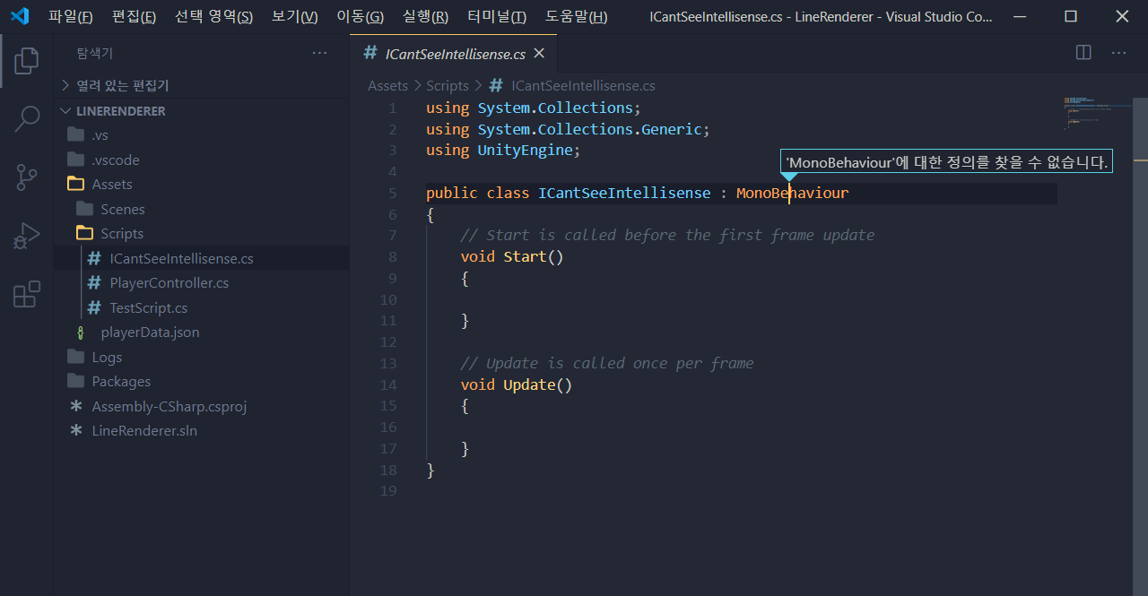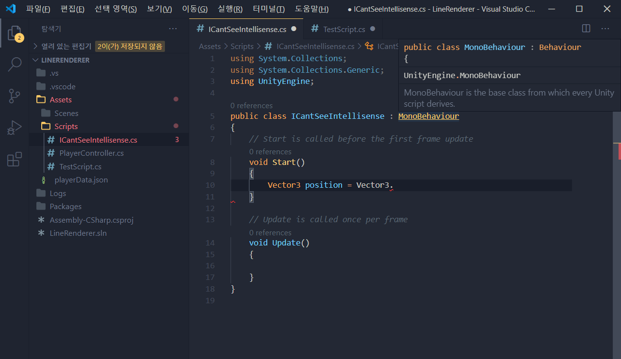 그런데 VSCode를 잘 사용하던 와중. Unity에서 실행했을 때 가끔 자동완성이 안 될 때가 있습니다.