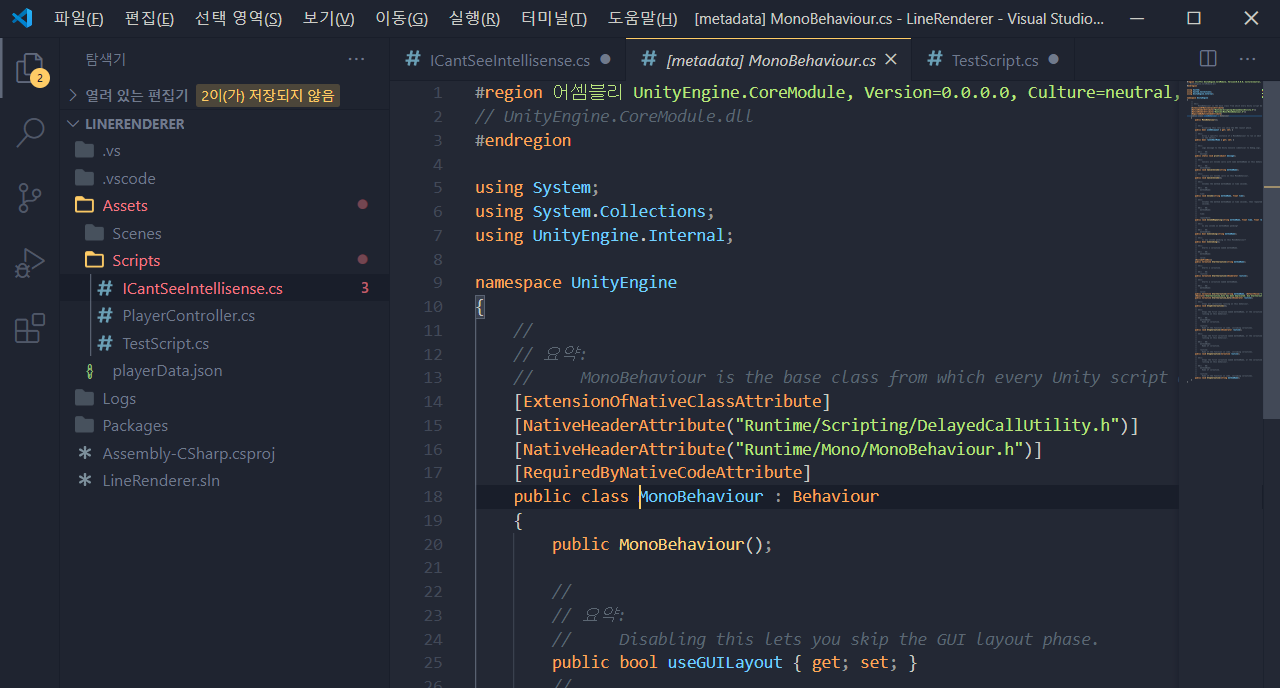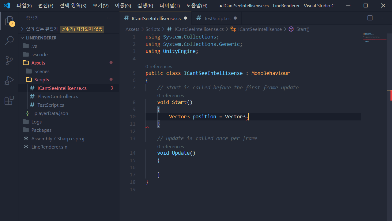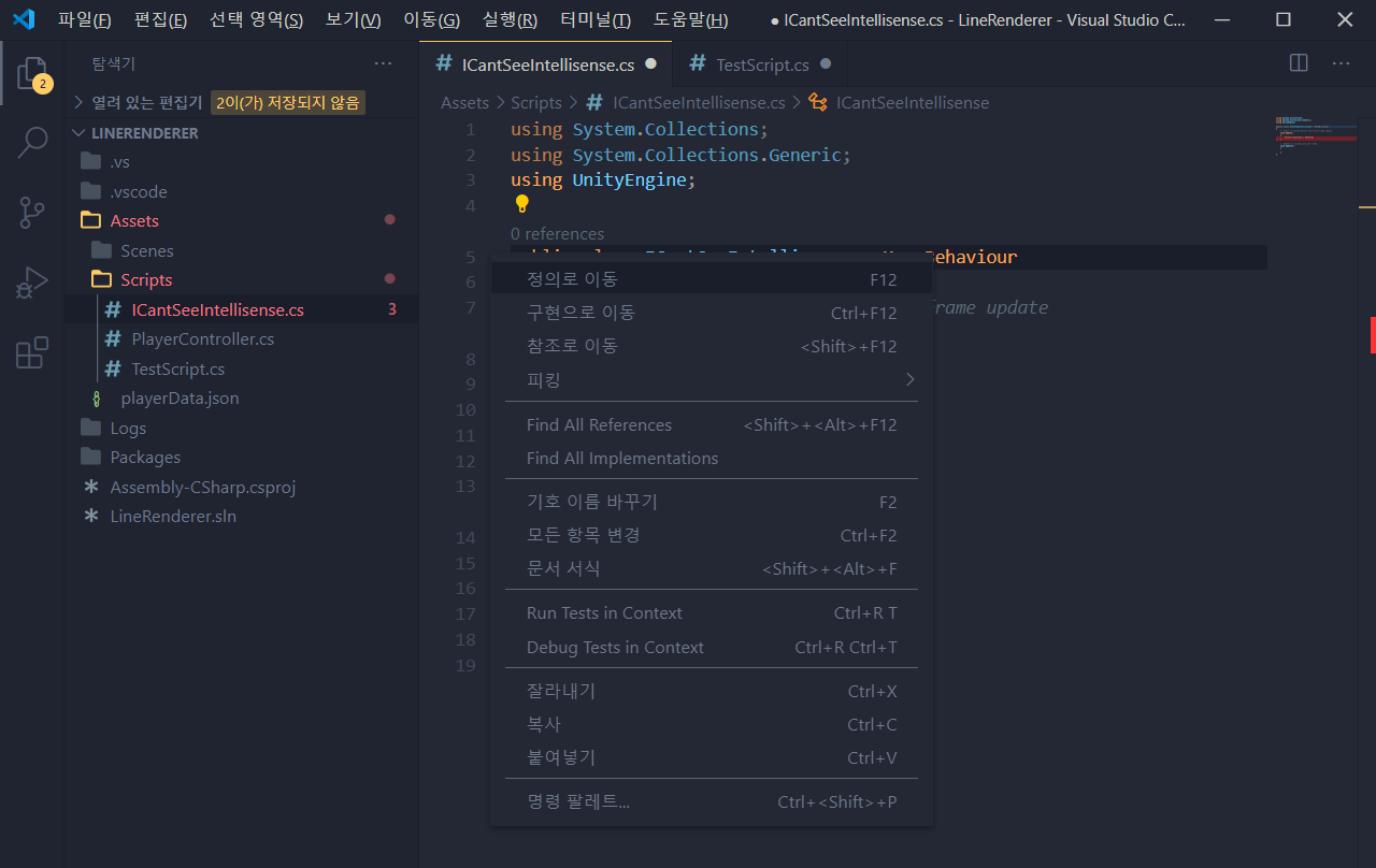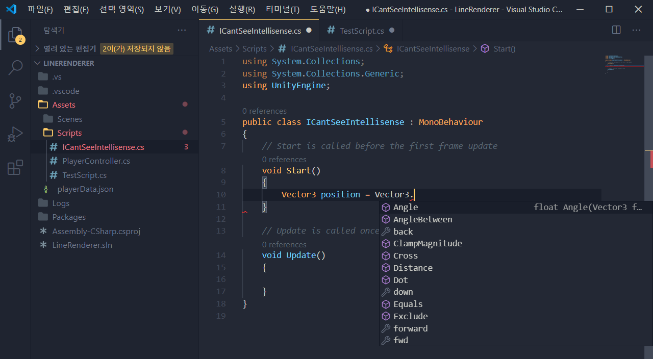 그런데 VSCode를 잘 사용하던 와중. Unity에서 실행했을 때 가끔 자동완성이 안 될 때가 있습니다.