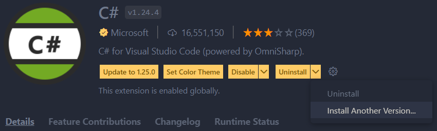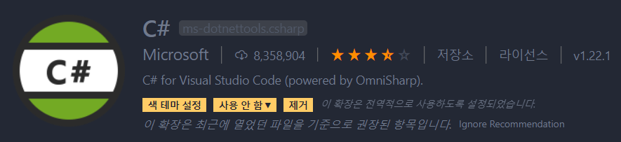 5. C# 익스텐션 버전 다운그레이드 (2022.07.02 추가) 혹은 업그레이드(2023.9.11)