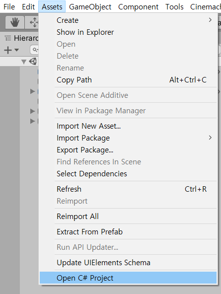 그다음에 Unity 상단 탭에서 Assets->Open C# Project를 통해 VSCode를 다시 열어줍니다.