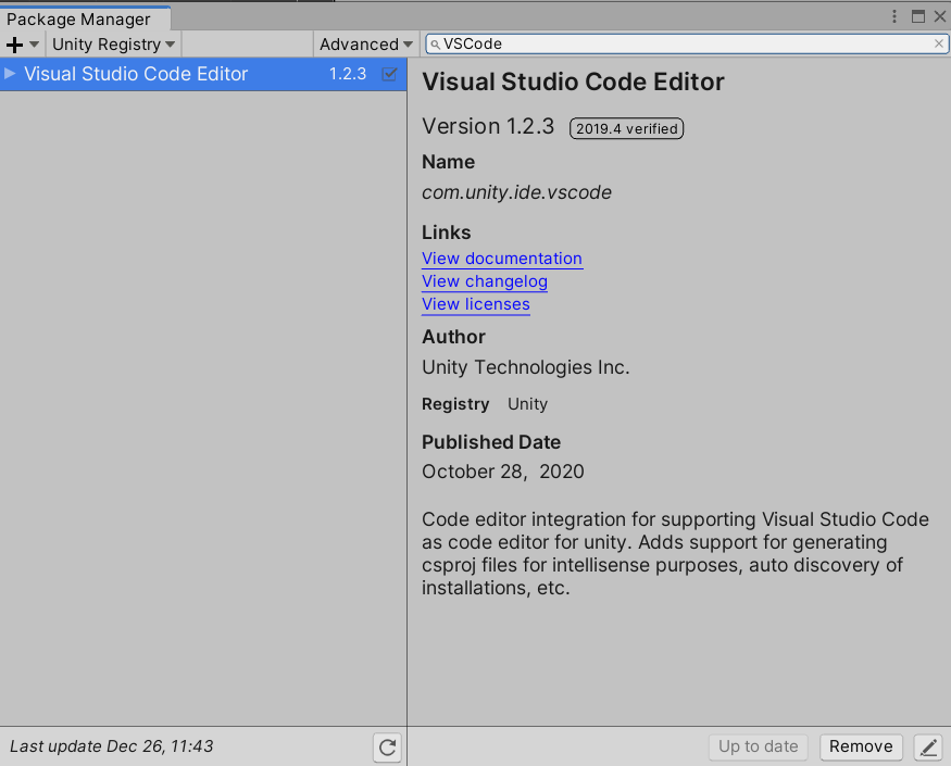 이 경우 해결 방법은 유니티의 패키지 매니저에서 VS Code 버전을 바꿔주는 것입니다.