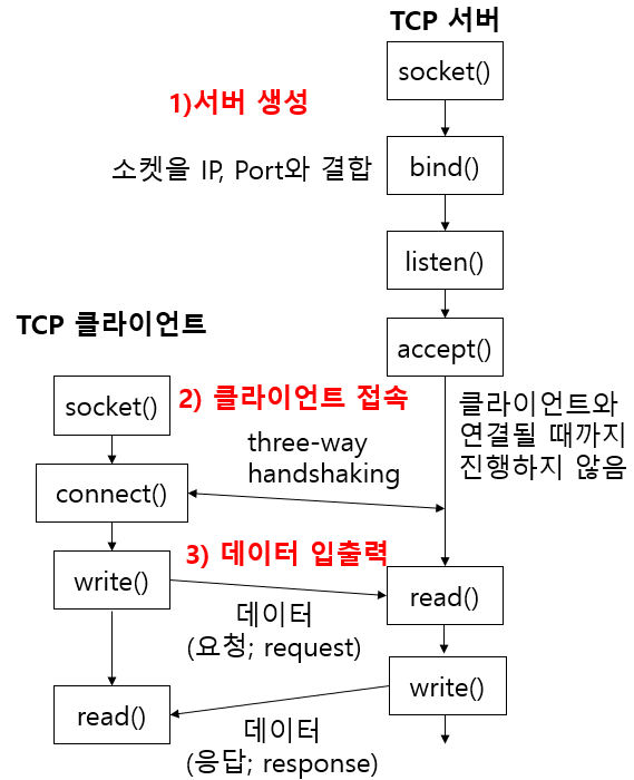 write()로 상대측에게 데이터를 전달하고, read() 함수로 상대로부터 들어온 데이터를 읽는다.