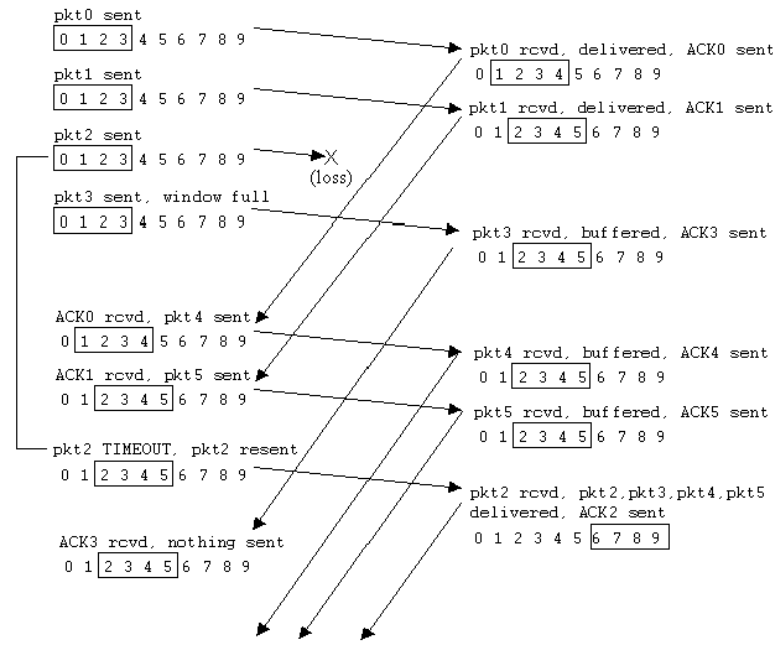 이때 receiver가 2번 패킷을 받게 되면 2번 패킷과 더불어 버퍼의 내용(3, 4, 5번 패킷)도 함께 저장해준다.