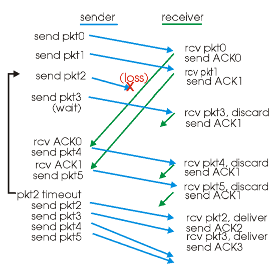 - timeout(n): n번 패킷이 유실되었을 경우, N번 패킷부터 윈도우 내에서 그다음에 있는 패킷을 모두 재전송한다.