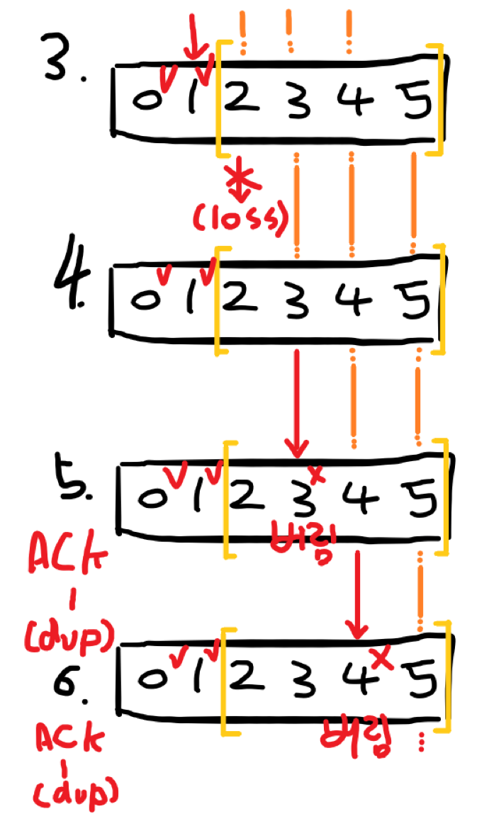 그러면 피드백 메시지는 ACK 0, ACK 1, ACK 2까지 전송되고 나서 3번 패킷이 유실되었으므로 다음 피드백은 ACK 2, ACK 2, ACK 2이 돌아오게 된다.