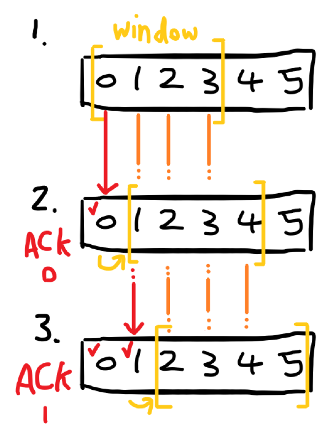 만약 윈도우 크기가 3이면 ACK가 돌아올 때까지 3개까지의 메시지를 동시에 보낼 수 있는 것이다.