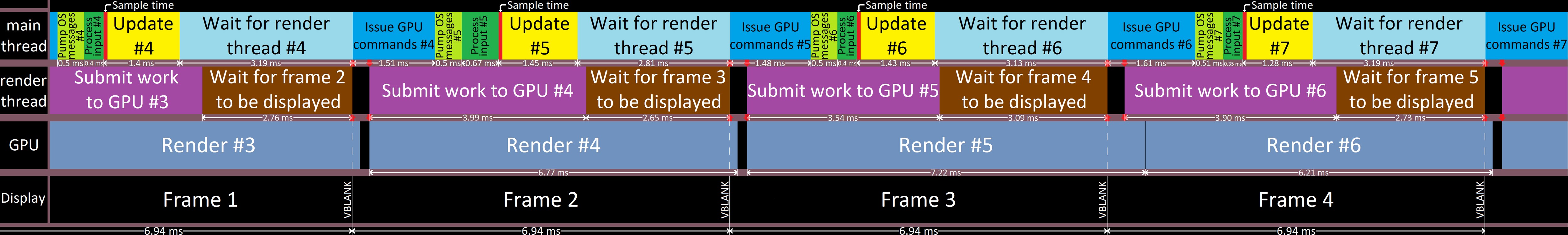 메인 스레드에서 ‘처리’ 부분은 OS 메시지 펌핑(Pump OS message), 입력 처리(Process input), 업데이트 호출(Update), 렌더링 명령 생성(Issue GPU command)이 있다. ‘대기’ 부분은 렌더 스레드 대기(Wait for render thread)가 있다. 처리 부분의 시간과 대기 부분의 시간을 합치면 실제 프레임 시간과 같다.