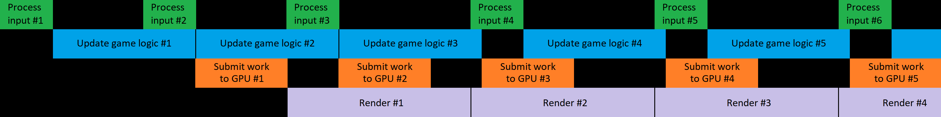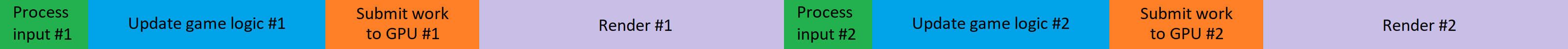 하지만 최신 게임 엔진에서는 성능을 증가시키기 위해 파이프라이닝 기법을 사용하여 한 번에 두 개 이상의 프레임을 처리하도록 한다.