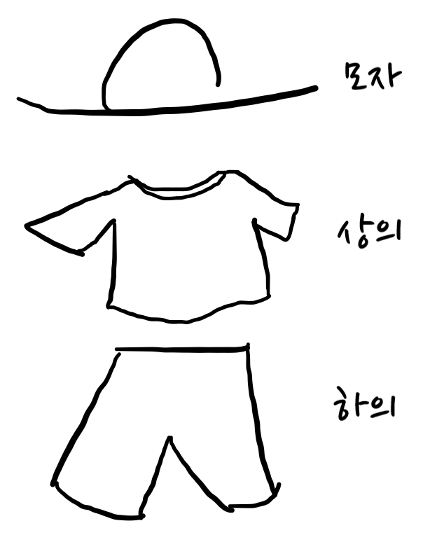 예를 들어서 고등학교 확률과 통계 과목에는 경우의 수를 찾을 때에 가지치기를 하며 모든 경우의 수를 세아린다. 아래와 같이, 모자, 상의, 하의를 입는 모든 경우의 수를 찾아낸다고 해보자.