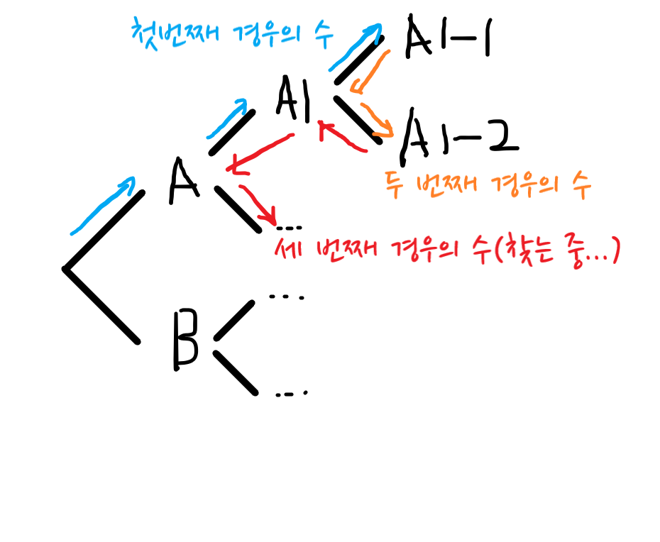 A->A1->A1-1까지 탐색을 한 후 더 이상 선택할 것이 없으니 이전 항목인 A1으로 돌아간다.