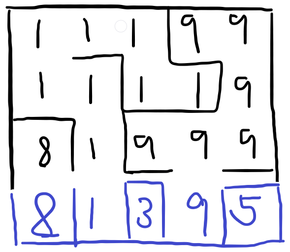 엘러의 알고리즘에서는 미로를 생성하는 과정에서, 집합을 이용해서 궁극적으로 두 열이 같은 공간에 있는지를 계속 추적한다. 무슨 말이냐 하면 같은 집합에 속한 칸끼리는 연결된 부분으로 보겠다는 것이다. 같은 집합끼리는 좀 길을 돌아서 가더라도 두 칸 사이에 길이 이어져 있고, 다른 집합끼리는 연결된 길이 존재하지 않는 것이다.