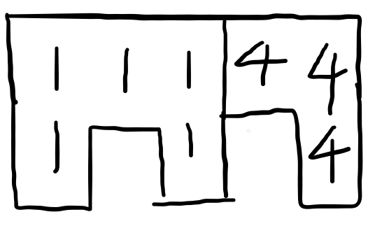 1번에서는 서로 벽으로 연결되어 있던 칸들이 집합이 합쳐지면서 같은 집합끼리는 벽을 허물고 영역을 합치게 되었다. 이에 따라 같은 집합끼리는 서로 연결되게 되었다.