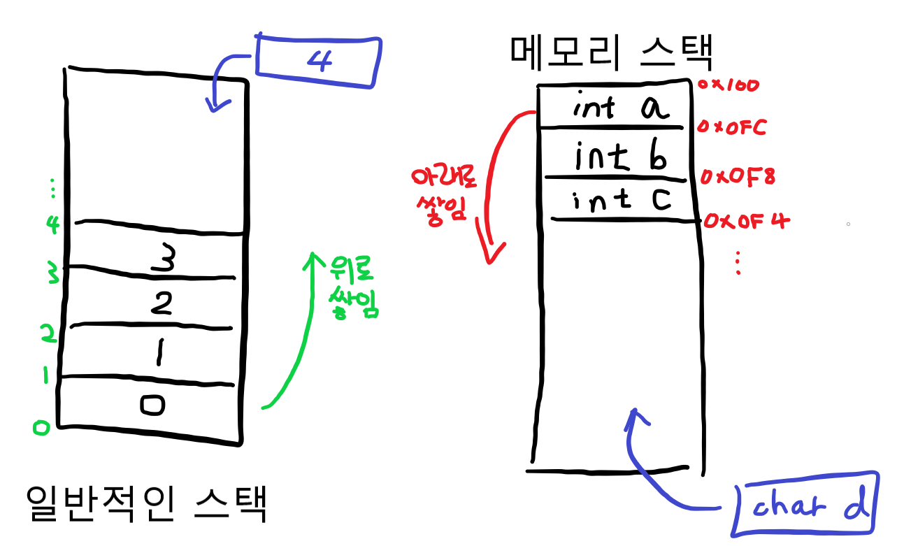 따라서 스택에 4바이트짜리 정수 데이터를 푸시(push)하면, 그림과 같이 주소가 점점 감소하는 형태가 된다.