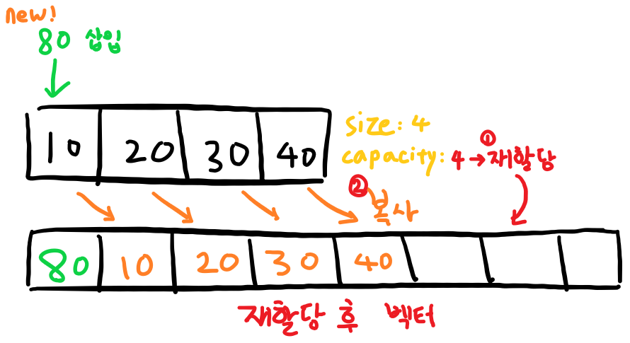 예를 들어 capacity가 4이고 꽉 차버린 상태라 하자. 이때, 80이라는 원소를 첫 위치에 삽입하면 재할당이 일어나면서 새로운 메모리 공간을 잡게 된다. 그리고 기존의 벡터 원소들을 새 메모리 공간으로 복사한다.