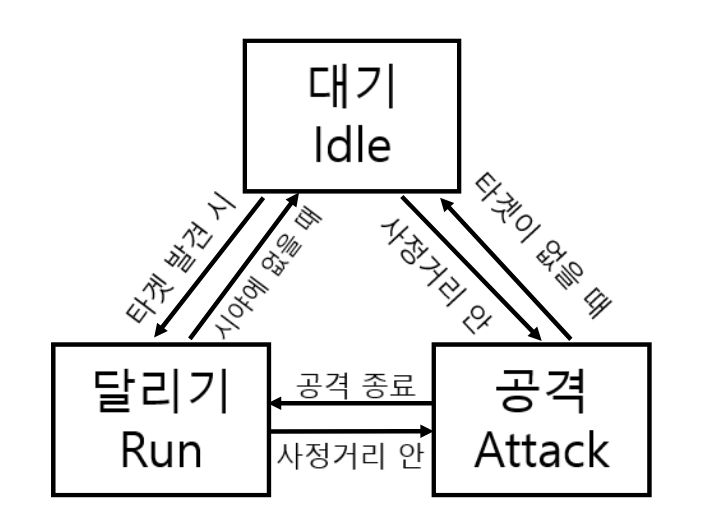 몬스터는 플레이어를 발견하면 Run 상태가 되어 달리기 시작한다. 플레이어가 사거리 안으로 들어오면 Attack 상태가 되어 공격한다. 이렇듯, FSM은 전이 조건이 만족되면 다른 상태로 바뀌어 적합한 행동을 취한다.