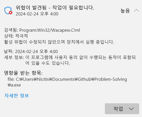 멀쩡한 C언어 코드가 갑자기 실행이 안 되는 문제가 생겼습니다. 방화벽이 코드를 보고 트로이목마(Win32/Wacapew.C!ml)로 의심한 것 같습니다.