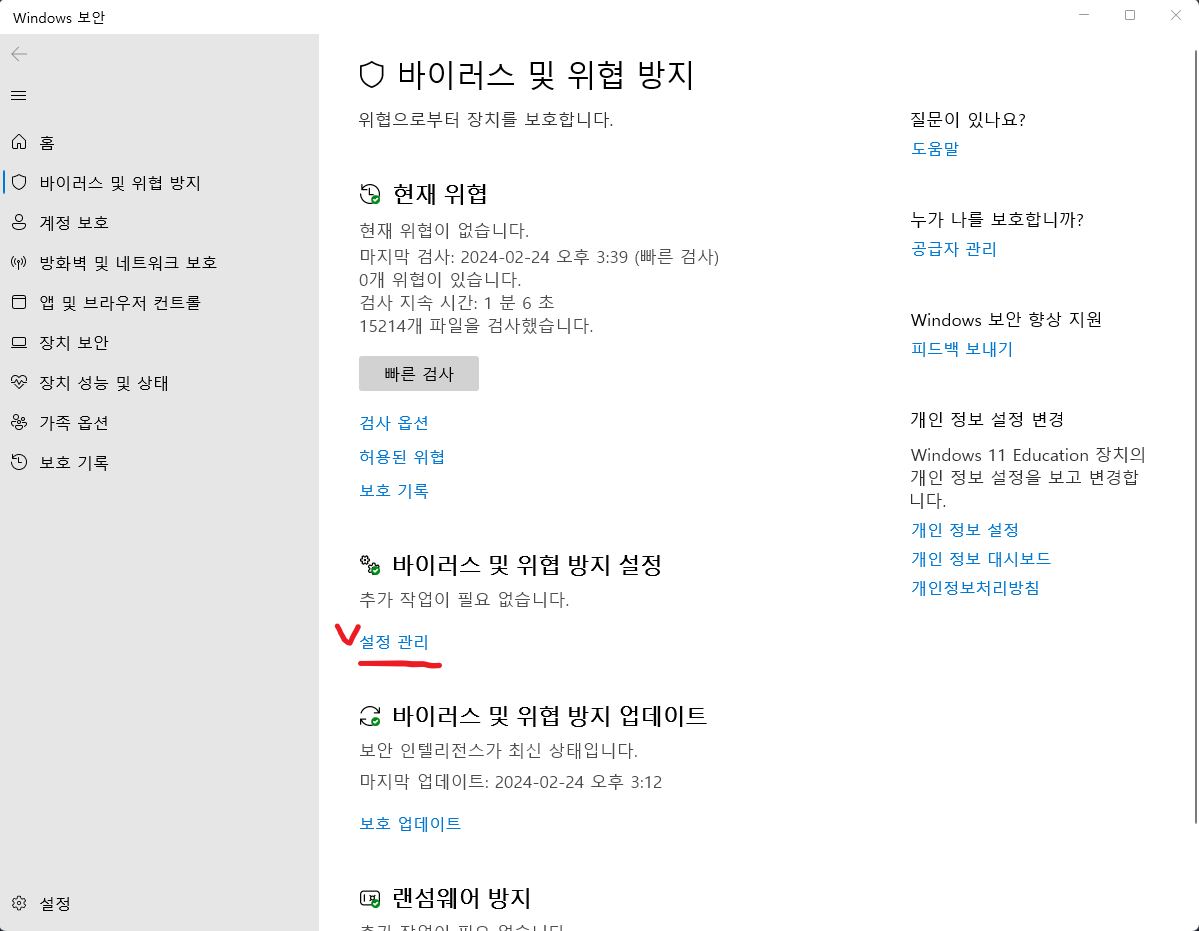 바이러스 및 위협 방지 설정/설정 관리를 누릅니다.