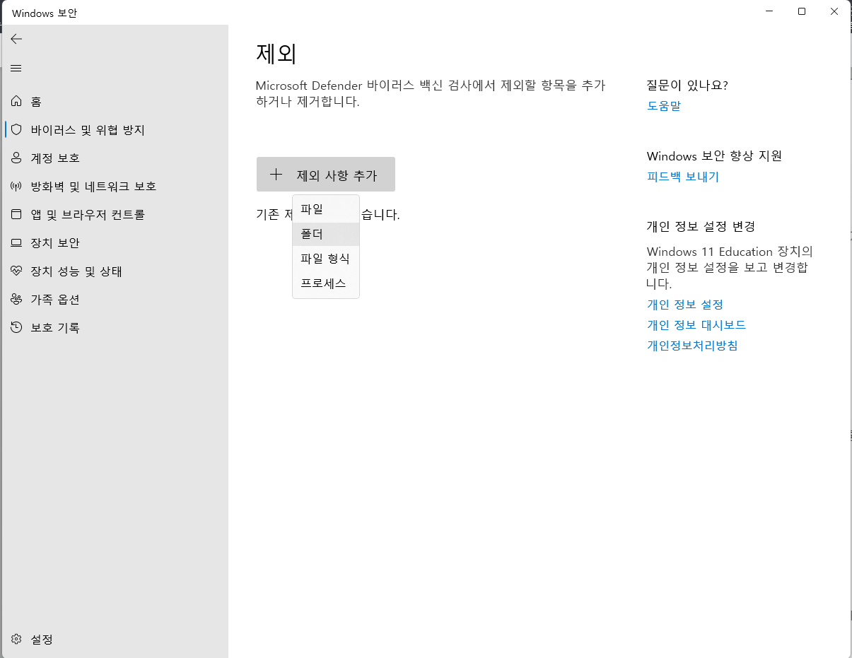 제외 사항 추가->폴더를 누르고, 검사 대상에서 제외할 폴더를 선택해 줍니다.