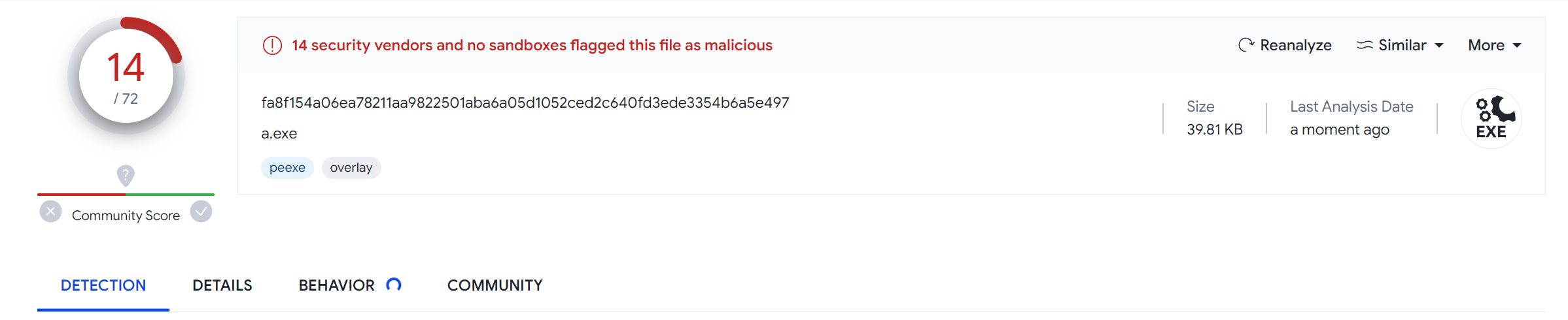 VirusTotal에서 실행 파일에 대해 검사를 돌리면 결과가 이러합니다.