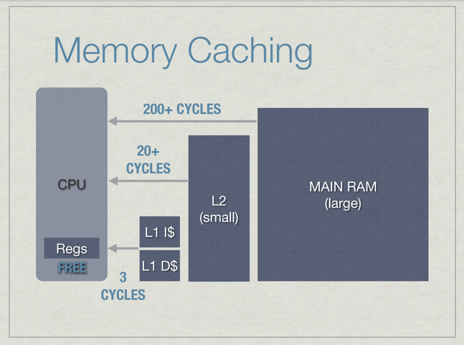 위 그림은 L1 캐시, L2 캐시, Main RAM으로부터 데이터를 가져오는 데에 얼마나 Cycle이 소요되는지를 표현한 그림이다.