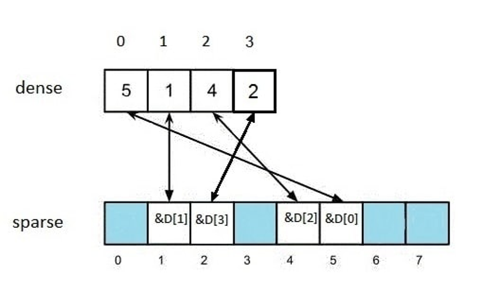 반면, 데이터를 검색할 땐 Sparse 배열을 통해 찾을 수 있는데, O(1)의 시간 복잡도로 데이터가 Dense 배열에서 어디에 있는지 찾을 수 있다는 점이 특징이다.