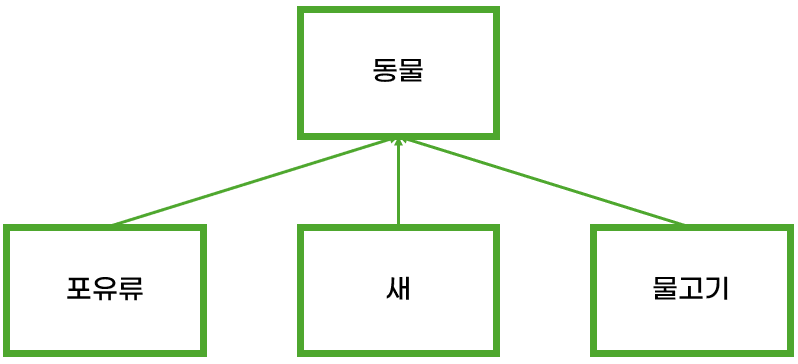 OOP에서는 객체가 갖는 특징을 표현하기 위해 상속을 이용한다. 동물이 갖는 특징을 똑같이 갖는 포유류, 새, 물고기 등의 종이 필요하다면, '동물' 클래스를 상속받아 '포유류', '새', '물고기' 클래스를 만드는 식이다.