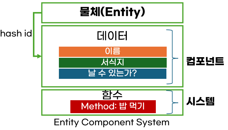 반면, ECS에서는 컴포넌트는 순수하게 데이터만 갖는다. 컴포넌트를 처리하는 함수는 '시스템(System)' 클래스에 존재한다.