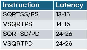 수학 계산 중에서 루트를 계산하는 sqrt는 꽤나 연산에 많은 비용이 들어가는 편이다. 단일 산술 연산이 많아야 3~4 cycle 정도 걸리는 데에 반해, sqrt는 보통 10 cycle 이상의 시간이 걸리기 때문이다.