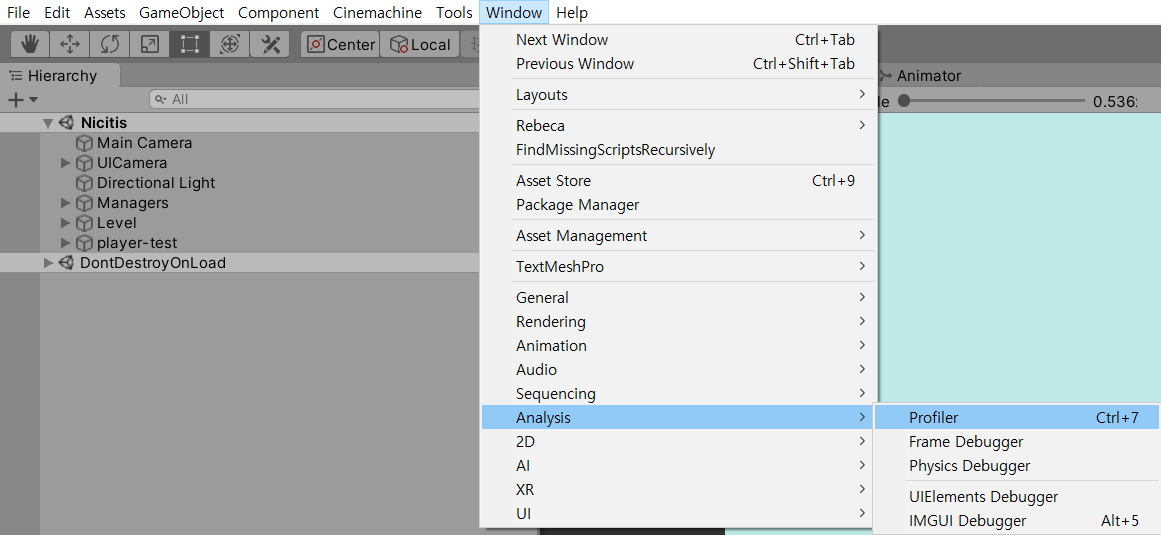 Unity 에디터에서 툴바를 통해 프로파일러 창에 액세스합니다. Window > Analysis > Profiler.