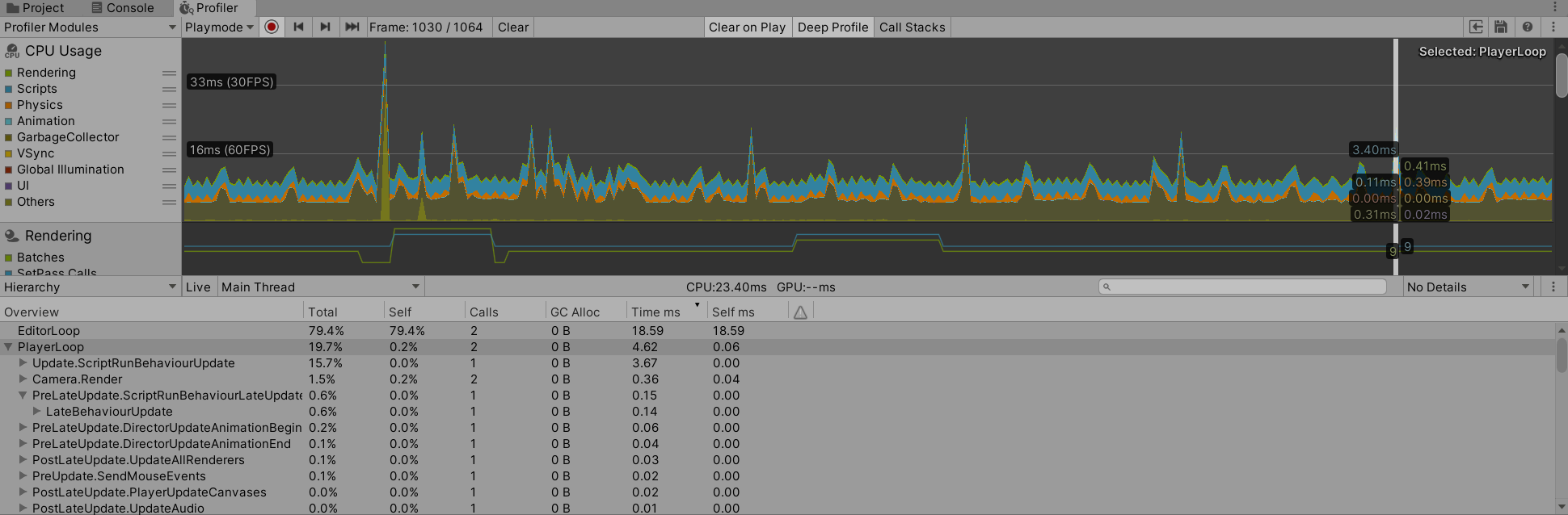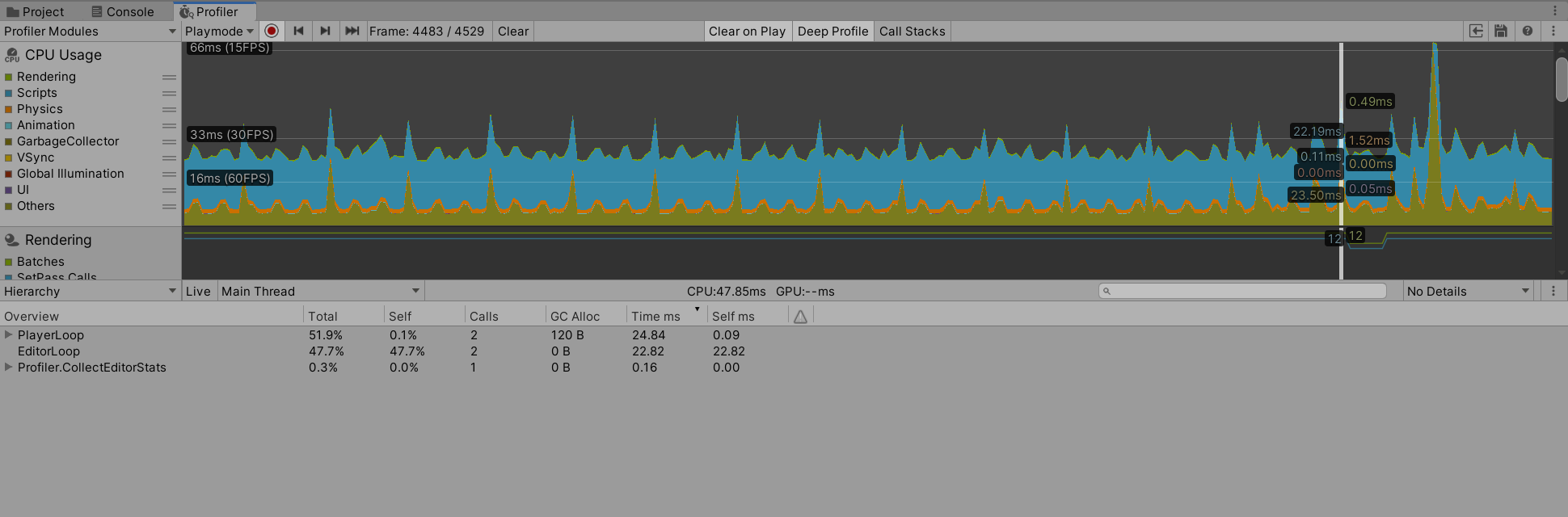 프로파일러 아래의 Hierarchy의 Overview를 보면 PlayerLoop, EditorLoop, Profiler.CollectEditorStats가 있는데 각각 게임 플레이, 유니티 에디터, 프로파일링에 소요한 시간을 가리킨다. 게임 성능에 영향을 주는 것을 확인하려면 PlayerLoop를 확인하면 된다.