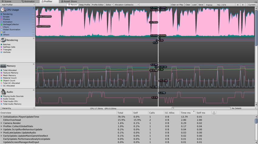 위와 같이 클릭해서 들어가면 프로파일러 창이 뜬다. 위 사진은 2019.4.2f1을 기준으로 하므로 위치는 버전에 따라 어느 정도 다를 수 있다.