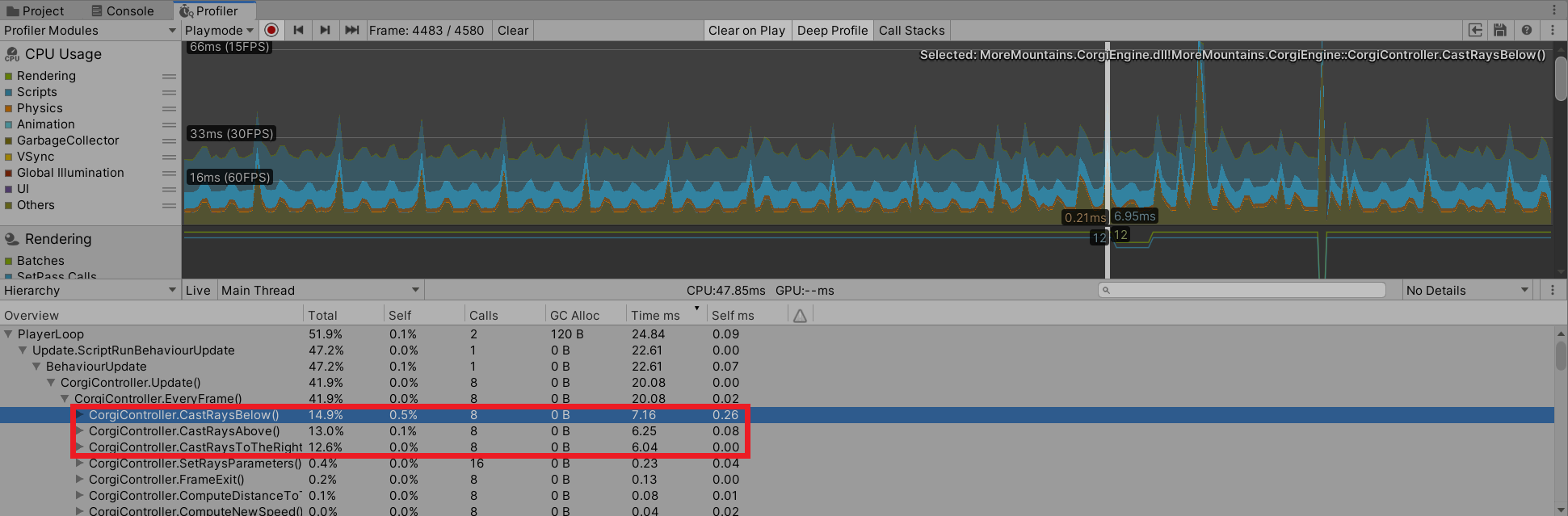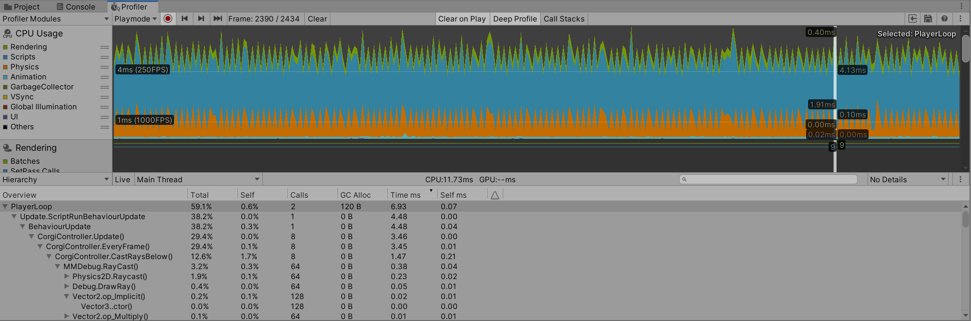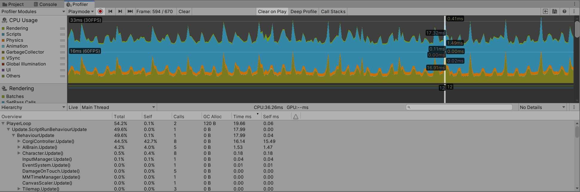 Others : 애플리케이션이 코드에 소비하는 시간으로, 다른 카테고리에 속하지 않습니다. 여기에는 전체 EditorLoop, 또는 에디터의 플레이 모드에서 프로파일링 시 프로파일링 오버헤드 등의 영역이 포함됩니다.