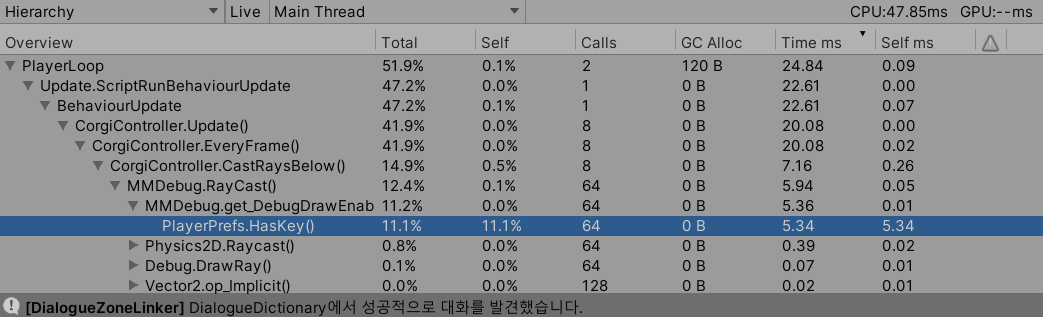 확인해보니 PlayerPrefs.HasKey()에서 대부분의 시간을 낭비하고 있었다. 해당 코드를 직접 확인해보자.