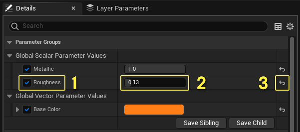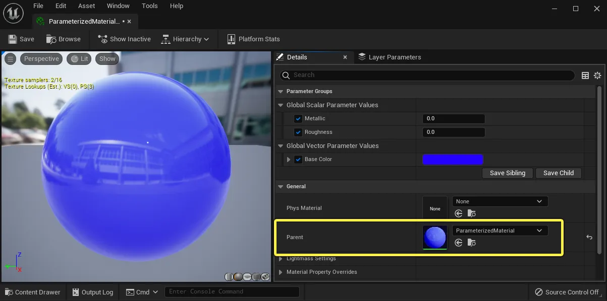 머티리얼 인스턴스에서 디테일 패널 > 일반(General) 섹션 > 부모(Parent) 프로퍼티를 볼 수 있는데,