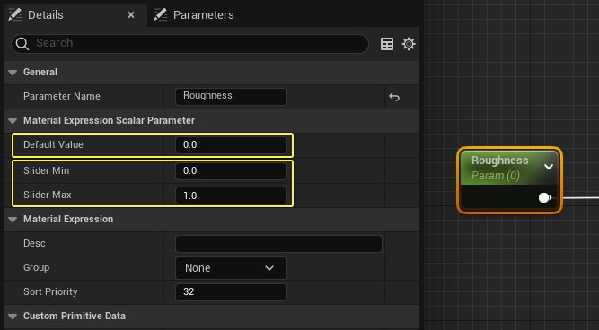 예를 들어, Roughness 값을 0~1 사이로 설정하기 위해 Slider Min를 0, Slider Max를 1로 설정할 수 있다.
