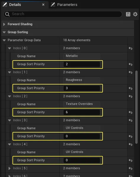 메가스캔 부모 머티리얼에서 사용하는 방식인데, 파라미터 그룹 이름에 00~07 등의 숫자를 붙이는 것이다.