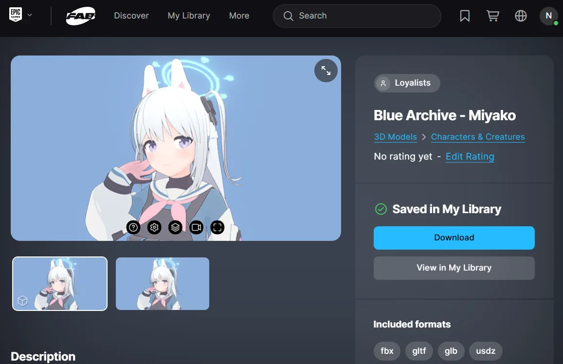 Fabs에서 블루아카이브의 미야코 캐릭터 모델을 발견하여, 이를 활용해보려 한다.