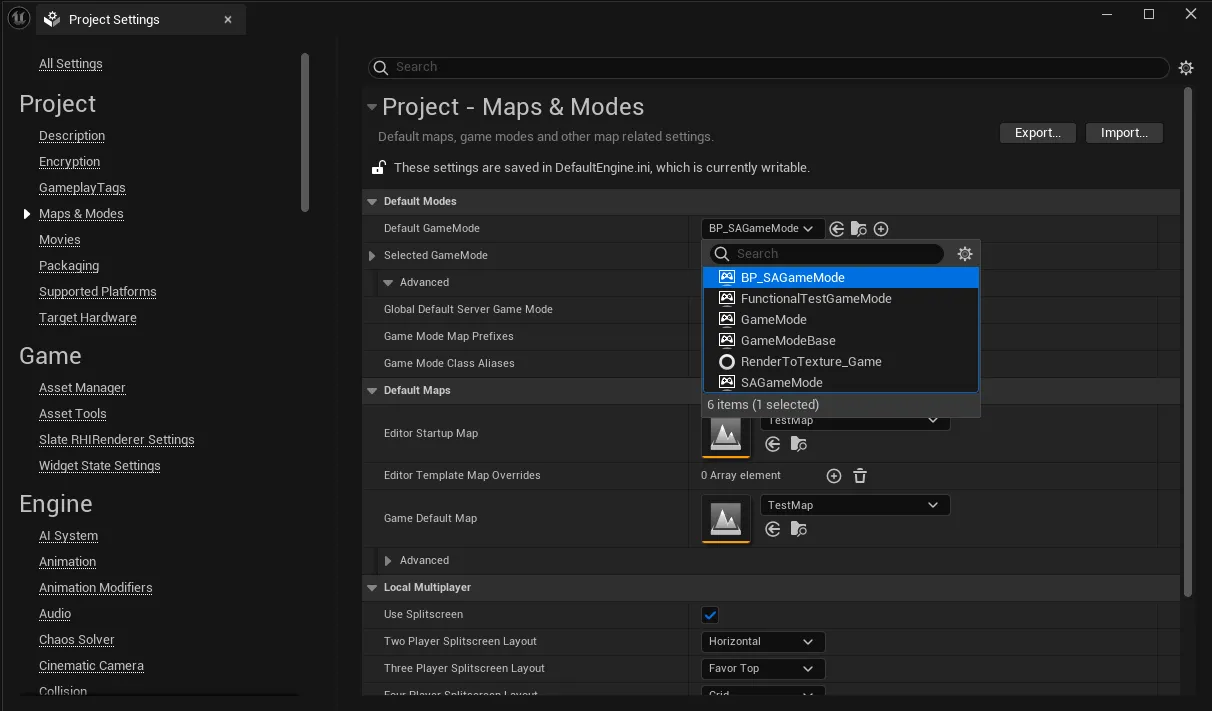 게임모드 설정이 끝나면, 이 게임모드를 Project Settings에서 설정을 해주어야 한다.