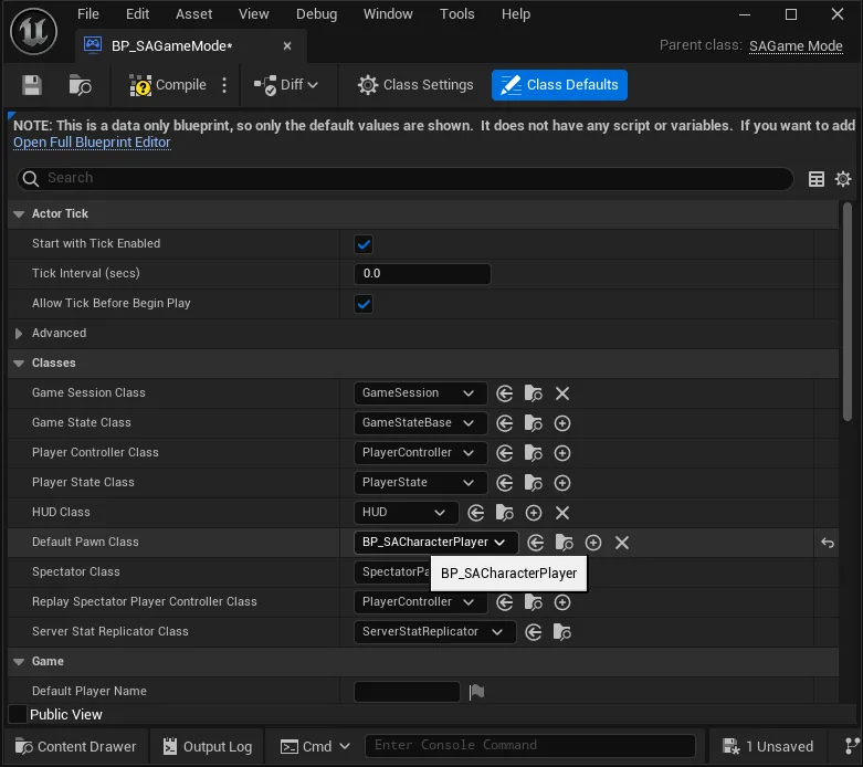 그리고 이를 상속받아 블루프린트 BP_SAGameMode를 만들었다. 기본적으로 C++ 클래스는 값 수정이 어렵기 때문에 블루프린트로 다시 객체를 만들었다.