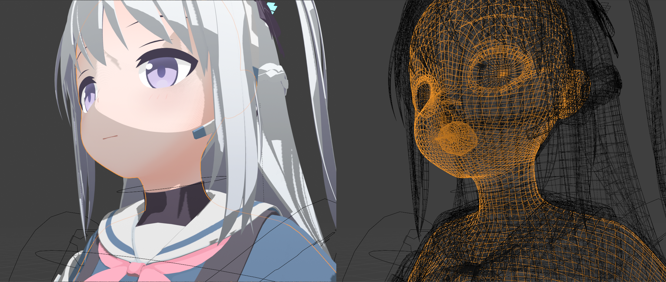 다만 모델을 좀 살펴본 결과, 근본적으로 모델의 ‘입 부분’으로 인해 문제가 생길 가능성이 높아 보였다. 위 그림에서 모델에서 입 부분을 보면 동그란 무언가가 있는 걸 볼 수 있는데, 이는 캐릭터가 여러 가지 표정을 지으면서 입을 벌릴 때 보이는 ‘입 안 부분’이 되겠다.