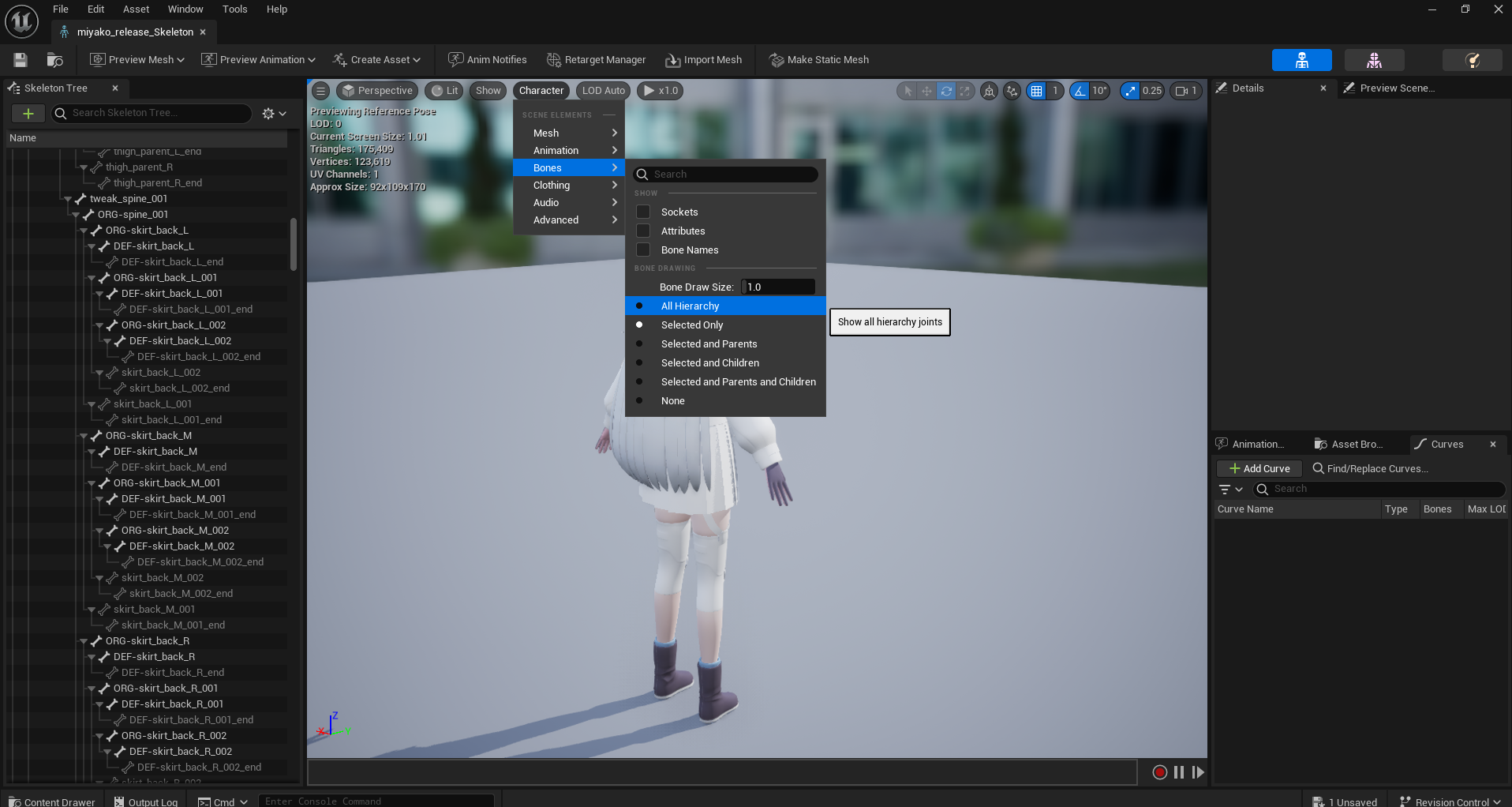 Skeleton 에셋을 열고 중앙의 Scene View에서 Character → Bones → All Hierarchy를 누른다.