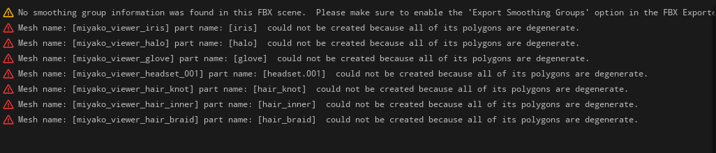 No smoothing group information … 로 되어 있는 경고 메시지는 작동에 큰 영향을 주지 않으므로 무시하였다. 그러나 그 아래에 뜬 다음과 같은 오류 메시지는 분석이 필요했다.