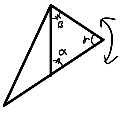 삼각형을 다른 방식으로 붙였을 때에도 똑같이 결과가 삼각형이려면, 위 그림에서 $ \alpha $와 $ \beta $가 같아야 한다.