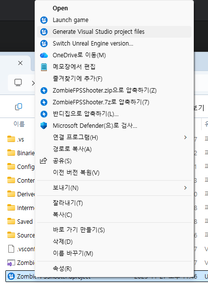 - Uproject file을 우클릭하여 “Generate Visual Studio Project Files”를 누른다.