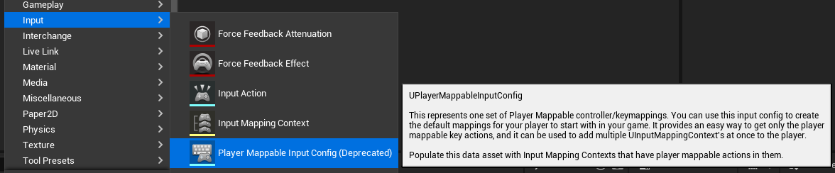 그 이유는 PlayerMappableInputConfig 자체가 Deprecated되었기 때문으로 보인다. 기존에는 아래와 같이 Player Mappable Input Config 데이터 에셋을 생성했는데, 현재에는 Deprecated로 표시되는 걸 볼 수 있다.