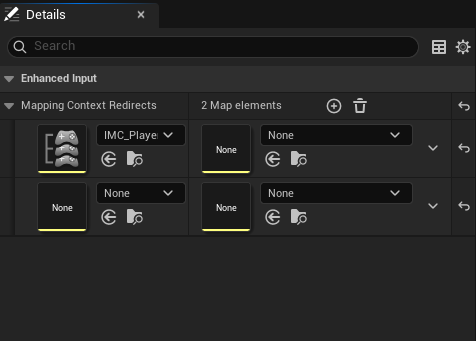 내부적으로는 이렇게 1:1로 리디렉션이 가능한데, 이렇게 되면 특정 플랫폼에서 빌드할 때 왼쪽에 있는 입력 매핑 컨텍스트(IMC_Player)의 값을 오른쪽의 입력 매핑 컨텍스트로 대체해 주게 된다.
