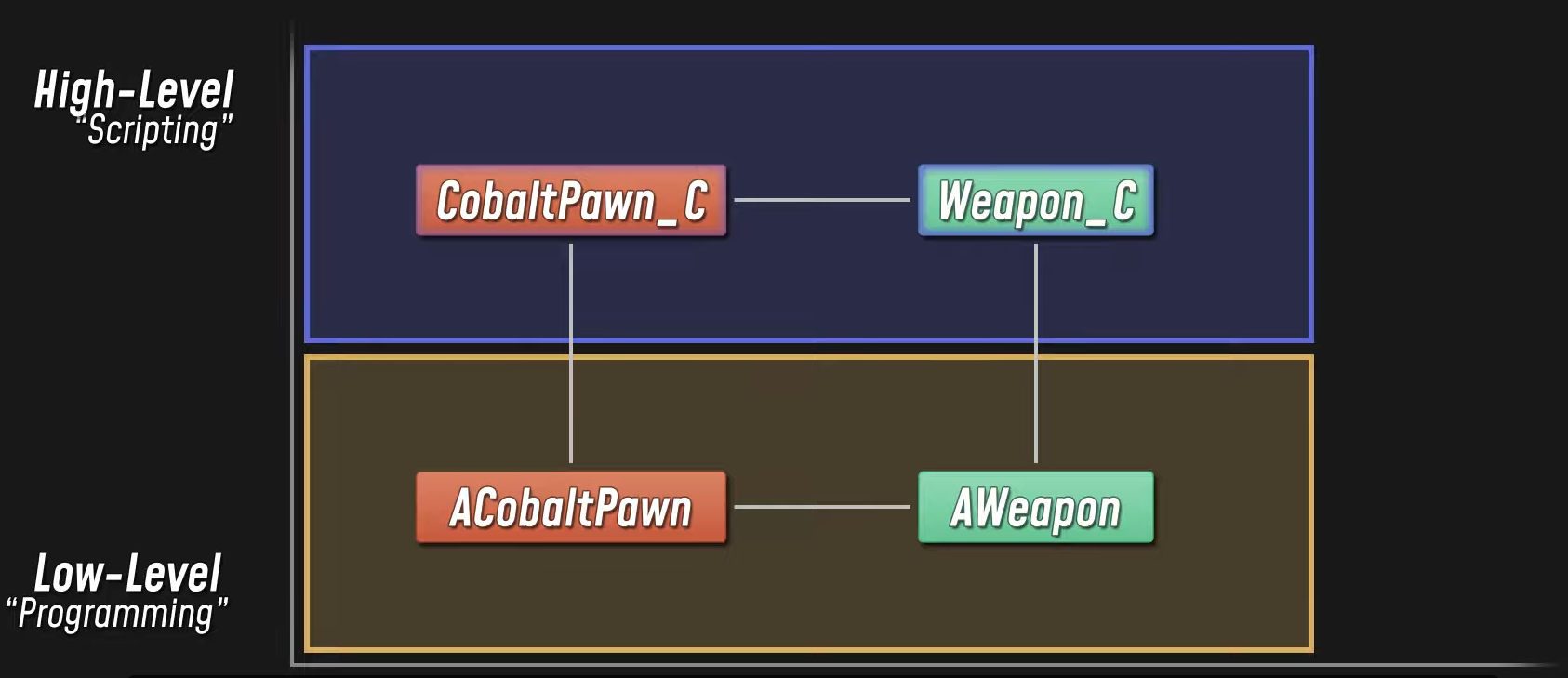 이 원칙을 따라 설계하면 위와 같은 구조가 되는데, 고수준의 기능을 블루프린트에서 구현하고, 기반이 되는 저수준의 구조는 C++에서 설계하는 식이다. 고수준의 블루프린트는 저수준의 C++ 클래스를 단방향으로 참조하며, 이 흐름은 반대로는 흘러가지 않는다.