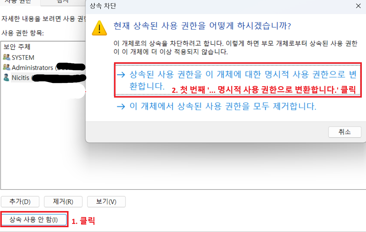 그 후 뜨는 창에서는 ‘명시적 사용 권한으로 변환’을 선택한다.