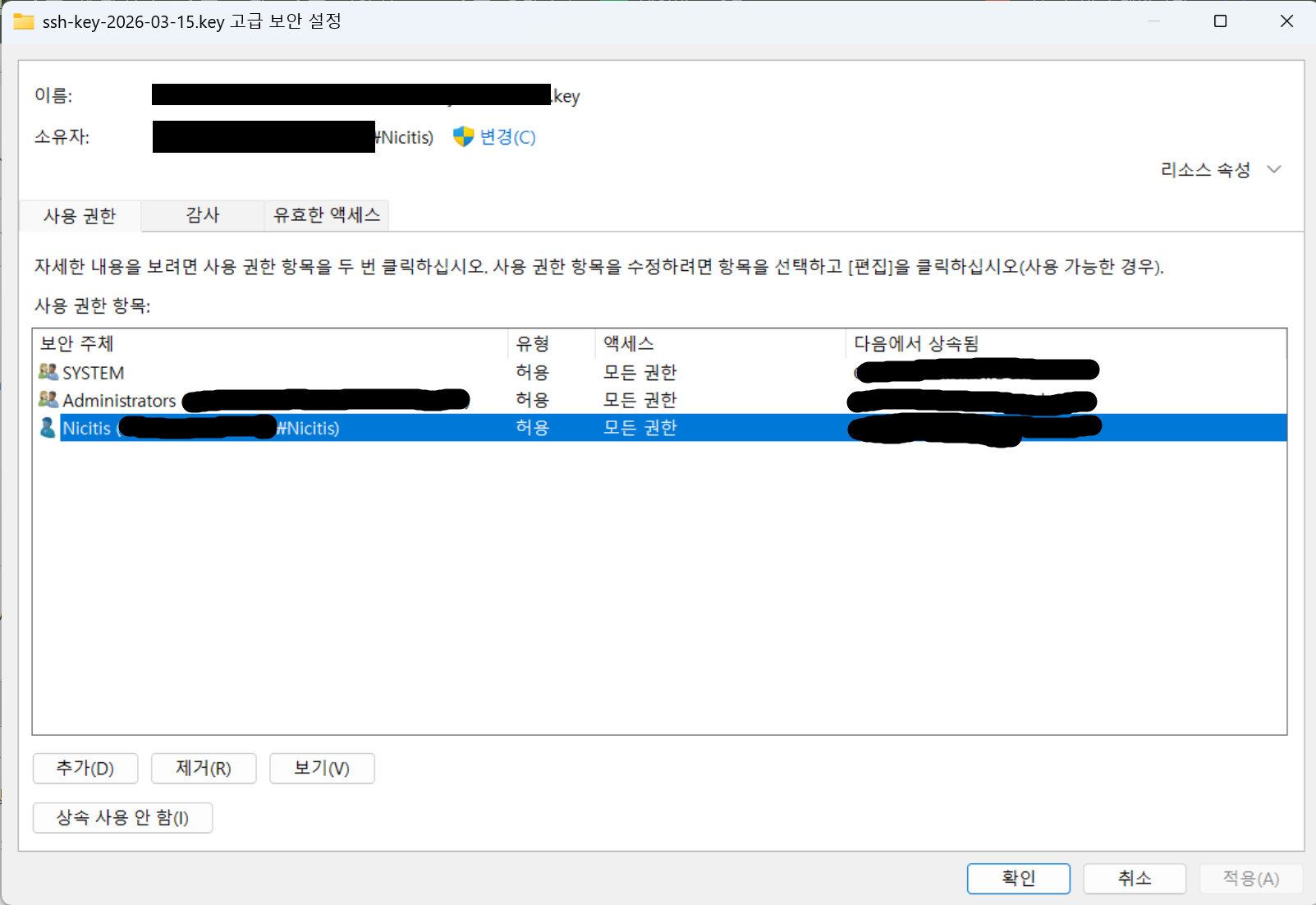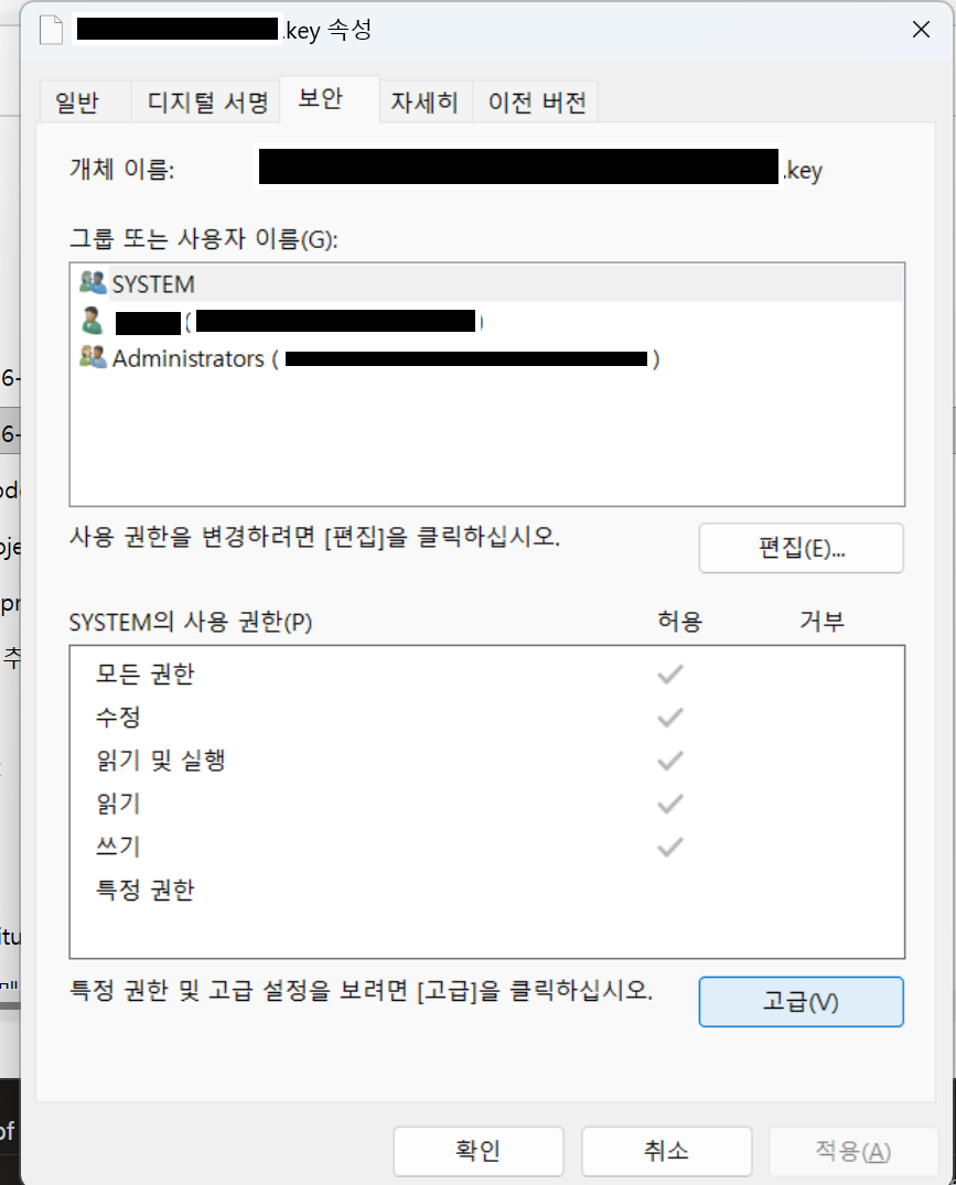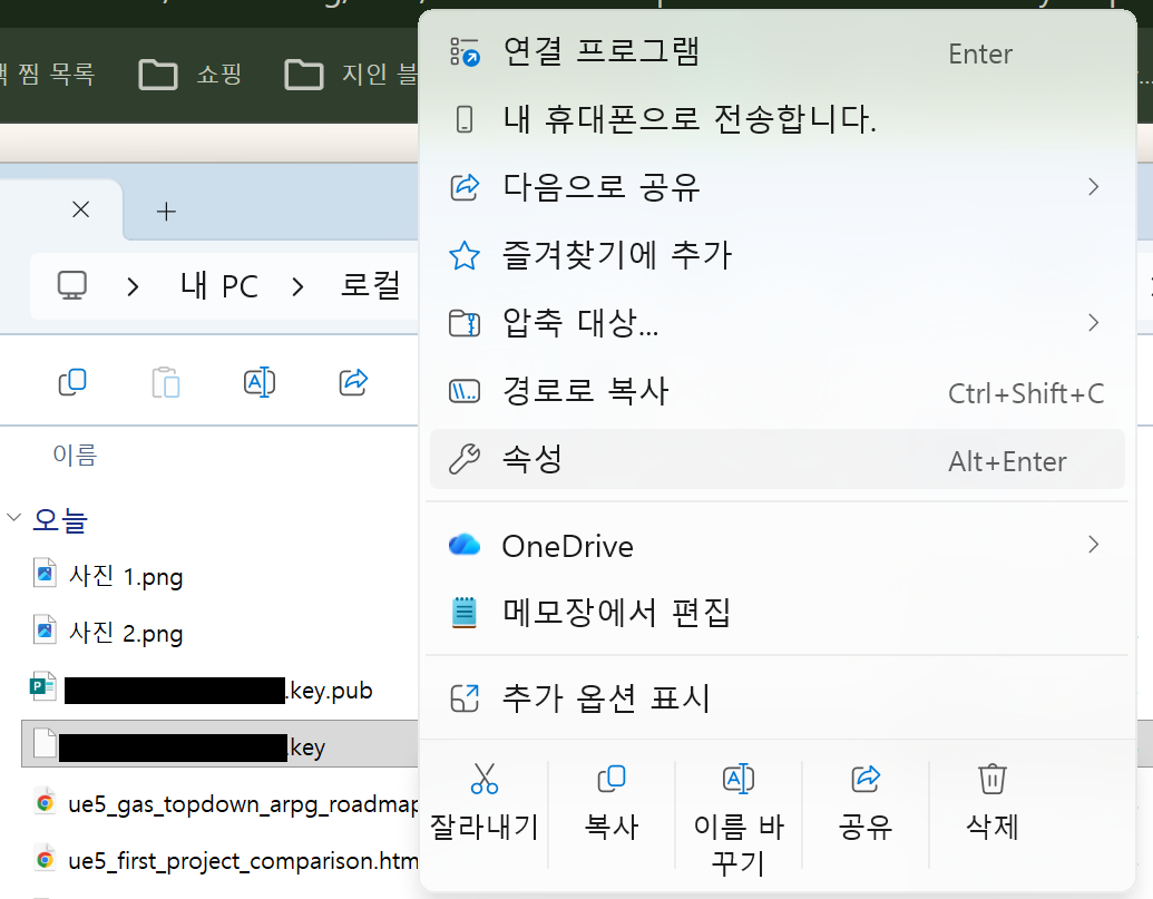 일단 위와 같이 ....key 형태의 private 키 파일을 우클릭해 속성을 누른다.